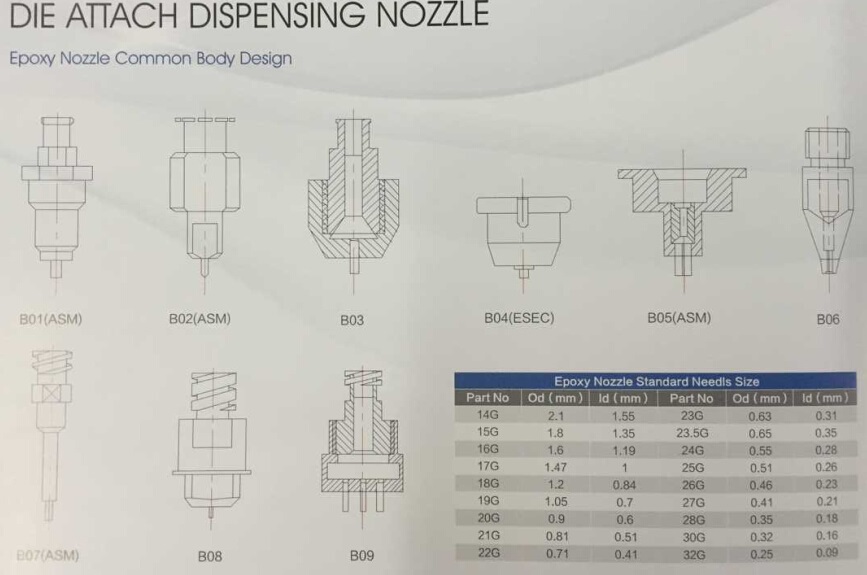 贴片及邦定工艺耗材:陶瓷吸嘴,常温橡胶吸嘴,高温橡胶吸嘴,电木吸嘴,引线框架吸嘴,顶针,点胶头,点胶针,打火杆。测试工艺耗材及治具:各种封装类的测试爪/片(QFN,DFN,SOP,DIP,SOT,SOD,TO-XXX),测试座及POGO PIN,(BGA,QFN,QFP,FLIP CHIP)封装测试设备(ISMECA,ASMESEC,OE,MUHLBAUER)